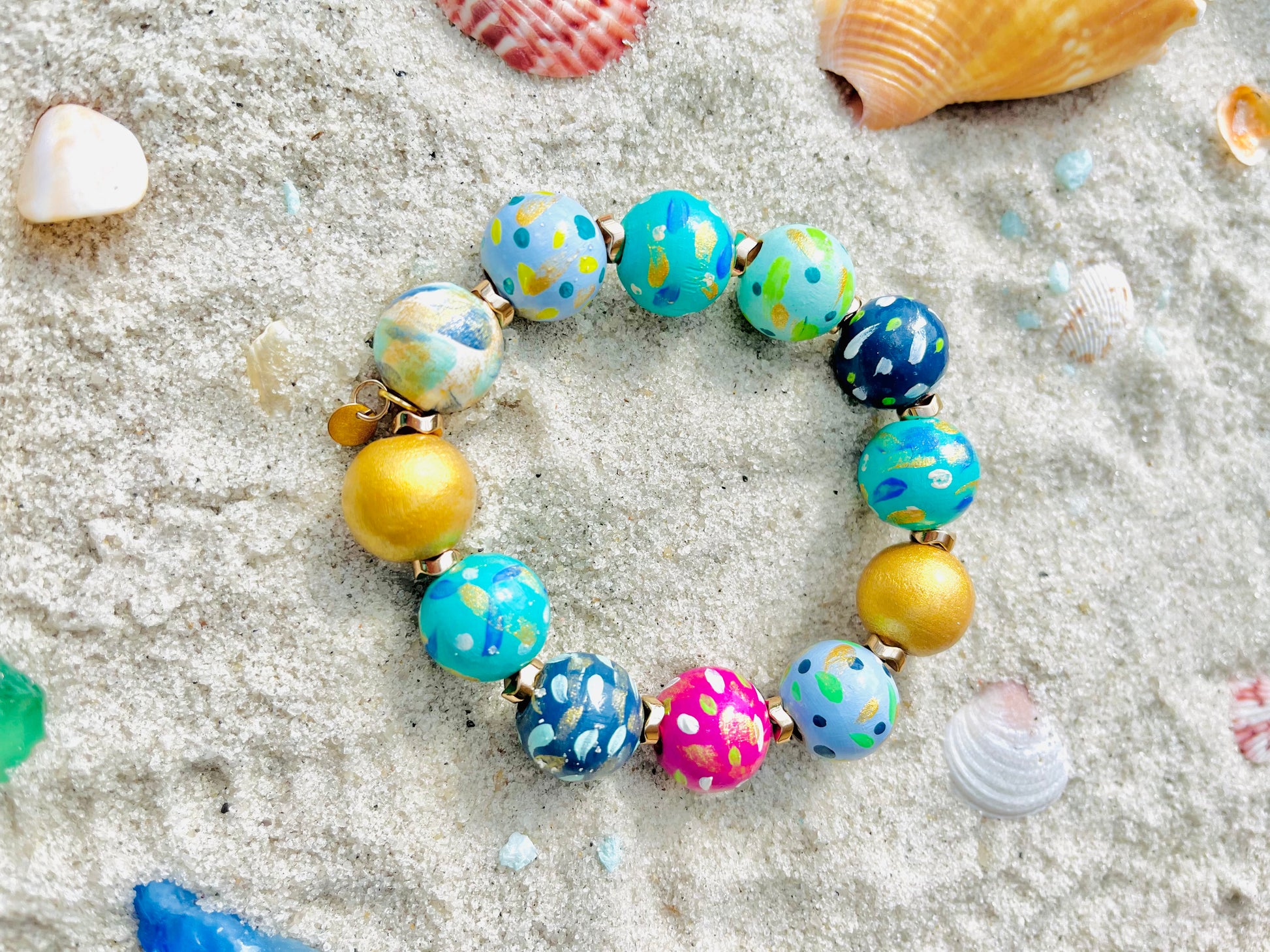 - Doce Cuentas de madera 1/2" entrelazadas con hematita en tono dorado